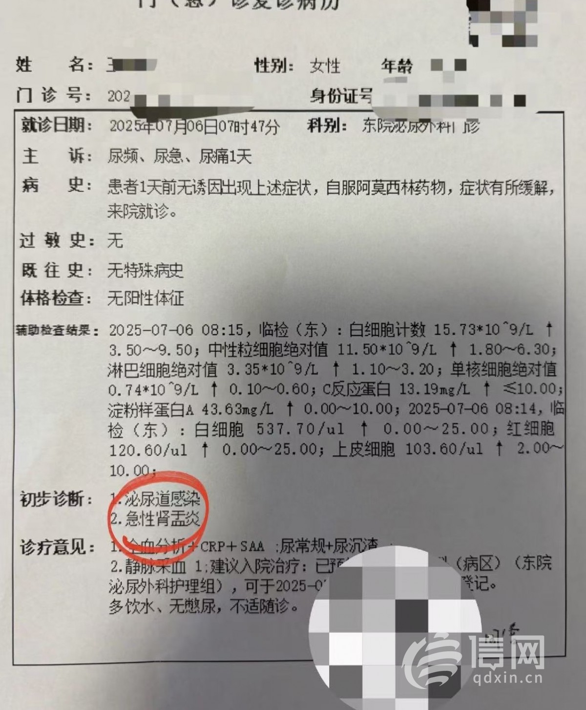 王女士表示,7月5日,她带着孩子和母亲一同来到涨巢,回家后当晚,王女士体温升高,伴随腹痛,次日凌晨紧急前往医院就诊。经血常规、尿常规等检查,医生明确诊断其为泌尿道感染、急性肾盂炎,需立即住院治疗,这一住便是 7 天。孩子在7日这天也因病毒细菌感染发烧,虽未住院,但持续的低热让家人忧心不已。