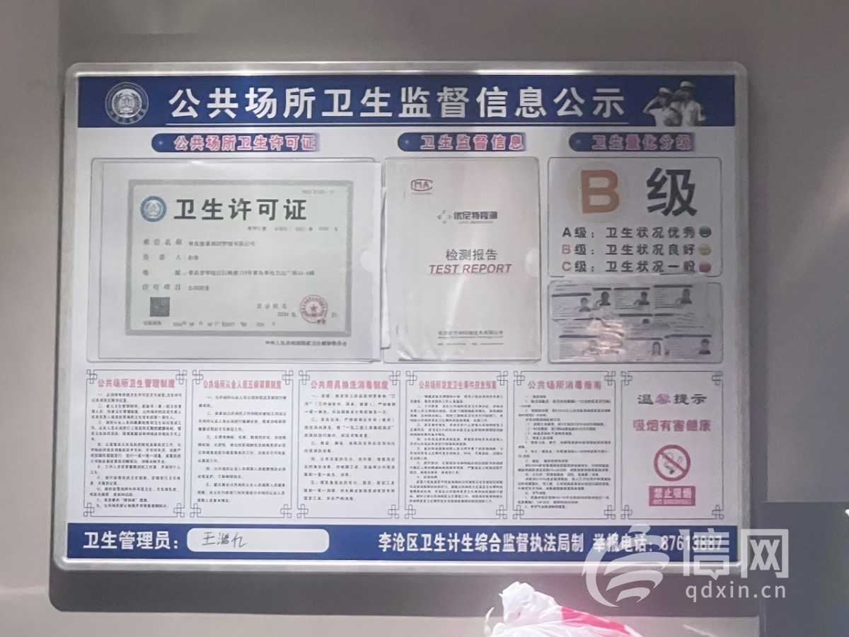 针对此事,李沧区卫生计生综合监督执法局工作人员介绍,接到王女士投诉后,执法人员第一时间到店检查,期间对沐浴用水及汤池水进行了水质检测,结果显示无水质问题,但发现涨巢2024年的卫生检测报告中,确实缺少沐浴用水嗜肺军团菌检测项目,据此依法对其处以1000元罚款。
