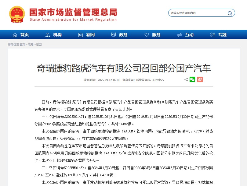 根据国家市场监督管理总局备案的召回计划,奇瑞捷豹路虎汽车有限公司将分两批次召回共计102223辆国产汽车。第一批次(召回编号S2025M0147I)涉及2019年4月18日至2020年10月30日生产的部分2020款路虎发现运动版和揽胜极光,共计37492辆;第二批次(召回编号S2025M0148V)涉及2020年3月2日至2023年5月30日生产的部分2020至2023款捷豹XEL和XFL,共计64731辆。