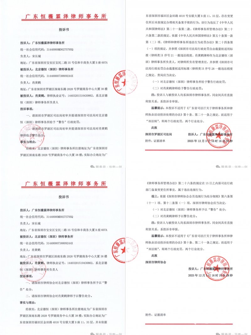 广东恒薇霖泽的投诉书中称,德恒深圳所的注册地址为深圳市罗湖区深南东路2028号罗湖商务中心大厦38楼,但该所官网公开标注的办公地址却为福田区金田路4018号安联大厦B座 11、33 层。根据《律师事务所管理办法》第二十六条规定,“律师事务所变更住所的,应当自变更之日起十五日内,经所在地设区的市级或者直辖市的区(县)司法行政机关报原审核机关备案”,但德恒深圳所长期在福田区异地办公,却未依法履行备案程序,属于违法违规行为。