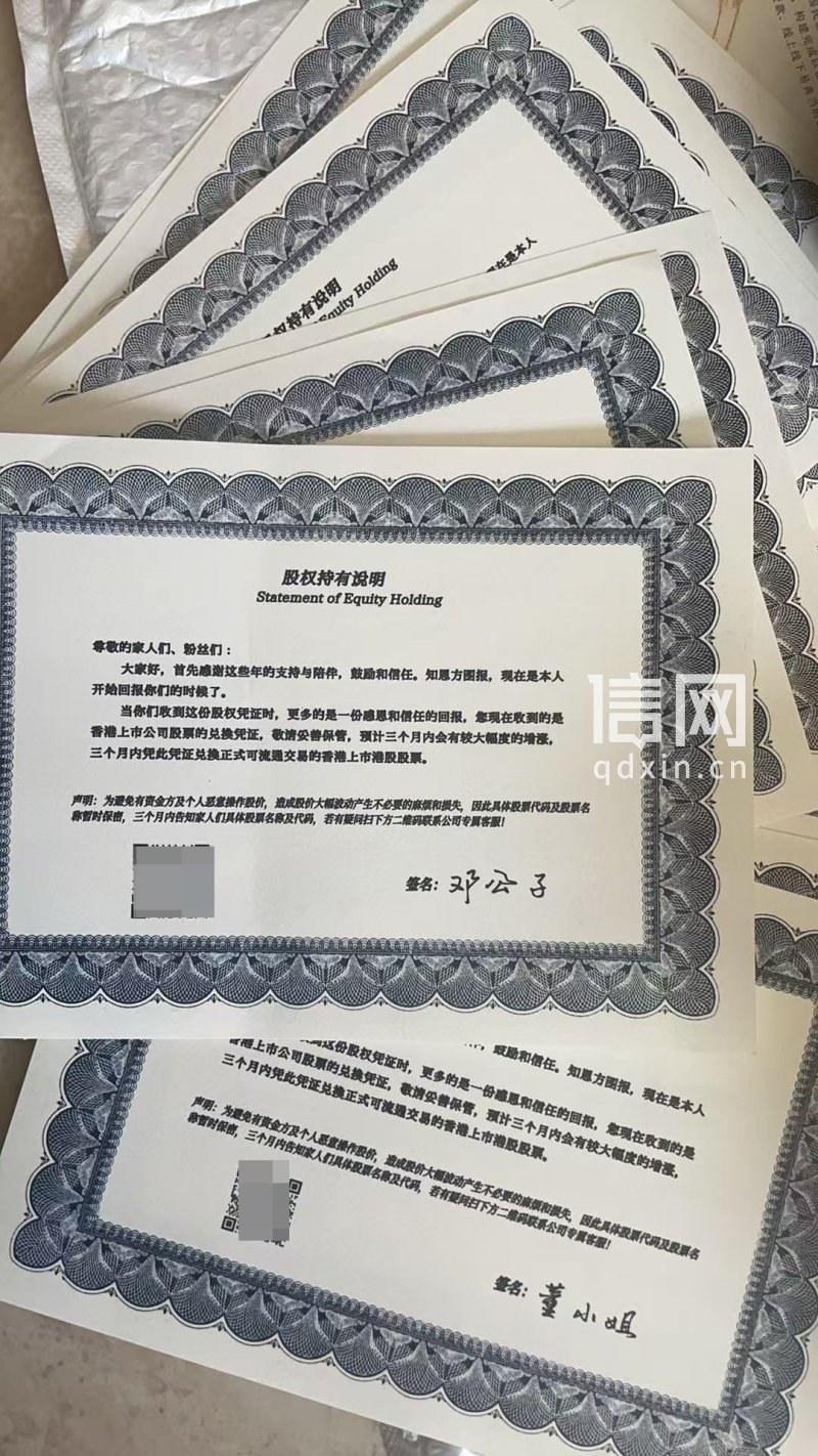 老陈告诉信号新闻,除了“要么违法贩卖文物、要么赝品诈骗”的问题,仅从这家公司的直播内容细节上,就可以发现很多疑点。比如其用来拿下老年客户的终极道具——“艺术品收藏信息备案证书”,上面的三个公章分别是山东昆廷国际拍卖有限公司、昆廷国际艺术品交流中心、艺术品资产化备案中心。前两个属于自己证明自己,后者从国家文物局公布的合法艺术品备案机构名单中根本无法查到。老陈还向证监会求证过号称可以藏品换股权的“永盛万国控股有限公司原始股”,得到的答复是,无此信息。信号新闻发现,“股权持有说明”的签名为“邓公子”“董小姐”。