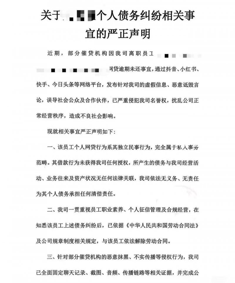 袁先生介绍,这位周姓员工今年30岁,借的网贷被用在打游戏上。无奈之下,公司只能将涉事的周姓员工开除,并且在网上发布了声明,指出因员工个人网贷逾期未还,催收机构在多个网络平台发布与公司相关的虚假信息并进行恶意诋毁,此类行为误导了社会公众与合作伙伴,严重侵害公司名誉,干扰正常经营秩序,造成不良影响。声明强调,网贷逾期属员工个人行为,相关债务与公司无关。该公司已依据规定与该员工解除劳动合同,并针对不实信息采取相应措施。
