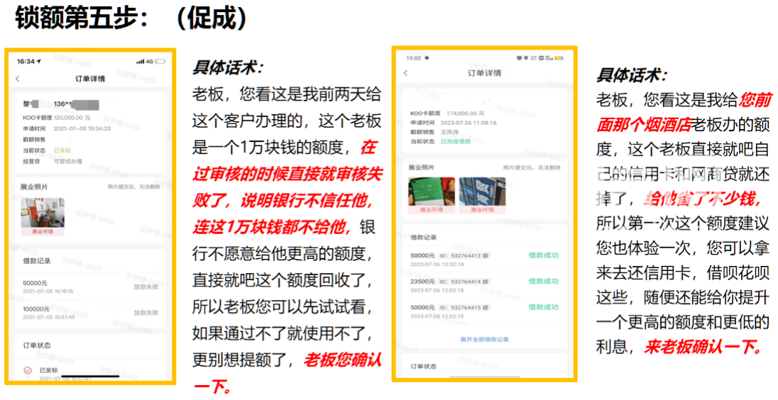 而对于一些直言“利息高”“现在不用钱”“额度太低”的客户,公司也有相应的话术技巧。抱怨“利息高”,就拉来同行作对比:“您支付宝借呗网商贷,借款一万,一天五元,我们最低能到一天一元,比他们划算。”没有用款需求,就会建议“养额度”:“如果您真的没有资金需求,建议您借款后取出来放到支付宝余利宝或微信零钱通,不多说,一万元一天能产生0.8元到1元的收益,对于您养额度更划算,您试试看吧。”