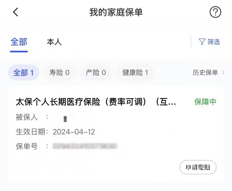张先生告诉信号新闻,去年4月11日,为了给自己退休多年的母亲多一份保障,他通过太平洋保险小程序,花费2518.45元为母亲购买了一份太平洋健康保险的蓝医保长期医疗险。“这个保险号称可以报销4种医疗花费并提供关爱金,总保额超过1千万,还可以续保至80岁。”张先生说,自己本身就从事理财方面工作,对保险也比较熟悉,经过朋友介绍和多家对比才买了这一款。2025年4月11日,该保险第一年到期后,他又进行了续保。