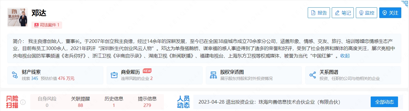企查查平台信息显示,深圳我主良缘肃配技术有限公司(现名:深圳缘定信息技术有限公司)成立于2024年9月,法定代表人为史贤涛,注册资本为30万元。该公司大股东为深圳我主良缘科技集团有限公司,实控人是邓达。邓达是我主良缘创始人,董事长,被誉为当代“中国红爹”。