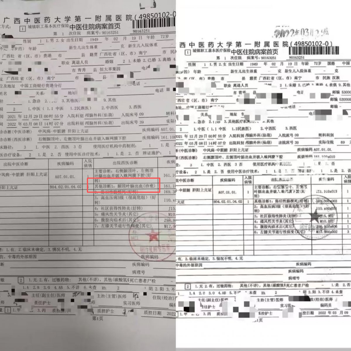 林女士说,自己在2022年6月和7月两次到医院复印了父亲的病历。病案号相同的两份病历,3月9日出院诊断是有差异的,其中一份的第一条就是“颞顶叶脑出血(治愈)”,另一份里却没有这一记录。