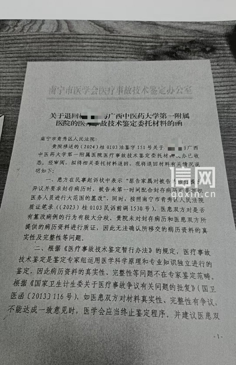 林女士提供了一份南宁市医学会医疗事故技术鉴定办公室下发的《关于退回XXX与广西中医药大学第一附属医院的医疗事故技术鉴定委托材料的函》,其中写明:“医患双方对是否有篡改病历的行为有较大分歧,贵院未对封存病历和医患双方所提供的病历资料进行质证,因此无法确认所移交的病历资料的真实性及完整性等问题。根据《医疗事故技术鉴定暂行办法》的规定,医疗事故技术鉴定是鉴定专家组运用医学科学原理和专业知识独立进行的鉴定,因此病历资料的真实性、完整性等问题不在专家鉴定范畴。”