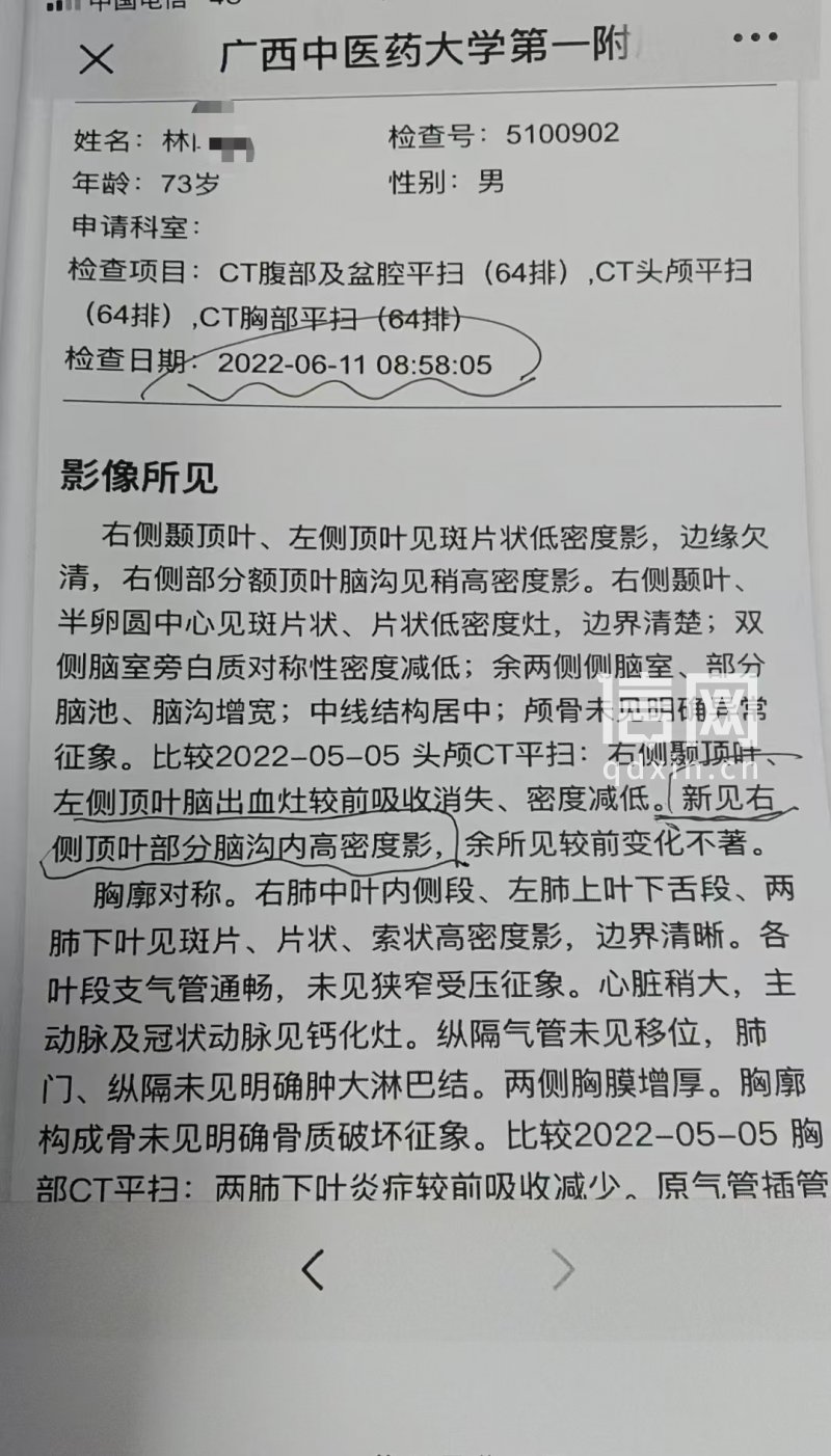 本以为连续的治疗对父亲的病情会很有帮助,但从2022年6月开始,林女士发现父亲变得特别嗜睡,“我问过医生,医生也做了检查,说是正常情况。”到了6月25日,林女士的父亲久叫不醒,医生在进行CT扫描时,发现患者出现了多发性脑出血,情况十分危急。随后,林女士的父亲被送进ICU治疗,由于错过了黄金抢救时间,老人的性命虽然保住了,人却没醒过来,成了植物人。