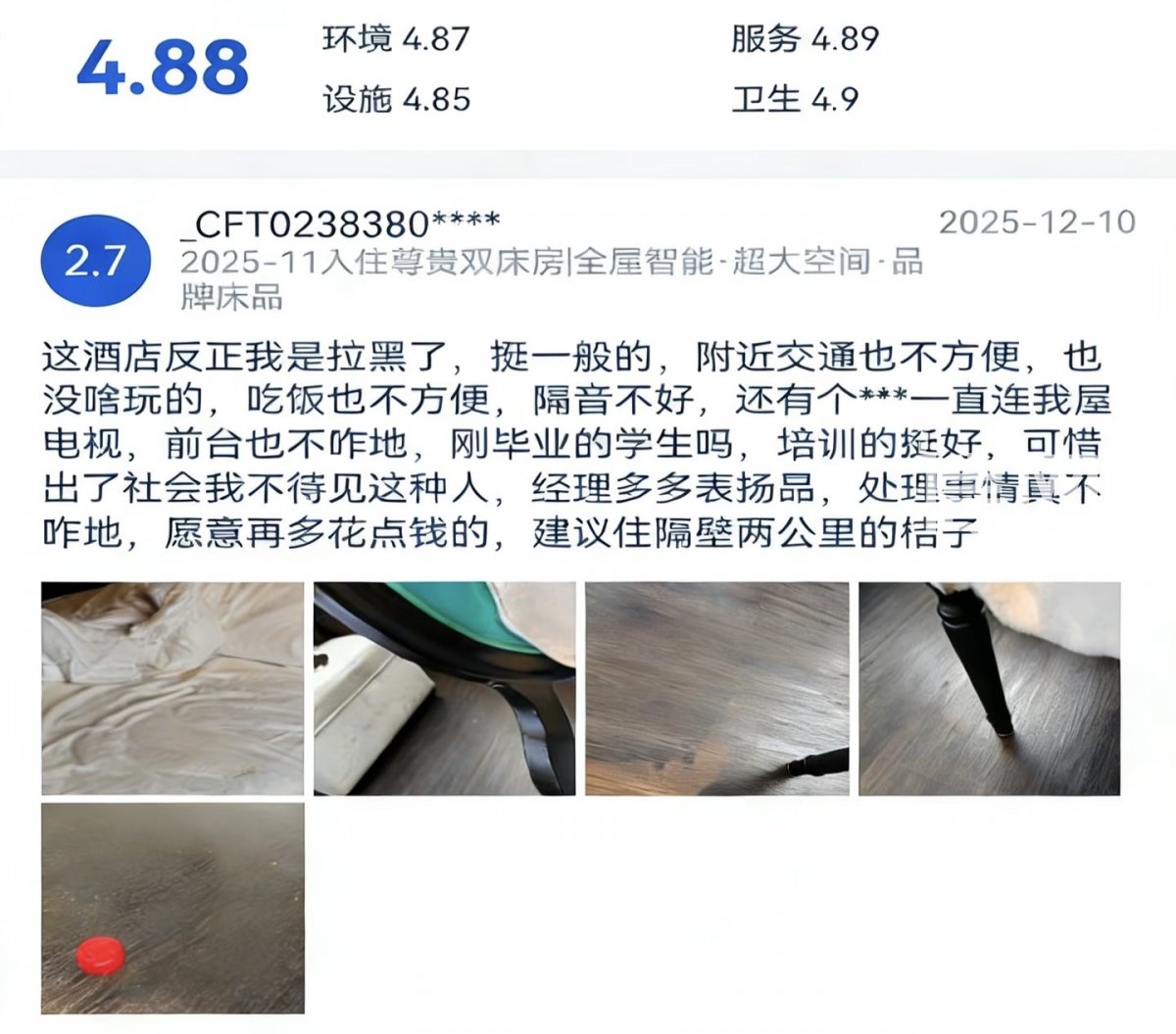 据兰欧酒店武经理介绍,这条差评由匿名用户在2025年12月10日发布。评论称,酒店交通餐饮不便、隔音差、前台服务不佳,附带了5张房间内的图片,还建议其他消费者“住隔壁的桔子酒店”。