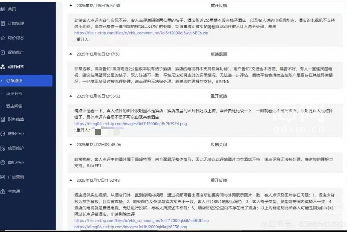 为维护声誉,兰欧酒店从2025年12月11日起先后7次向携程提交图片对比、实拍视频、地理位置证明等申诉证据,均遭平台驳回,理由包括“双方陈述不一致”“图片为局部特写无法评估”等。直到第8次申诉后的12月24日下午,该差评最终被判定与行程实际情况不符,进行了隐藏处理。