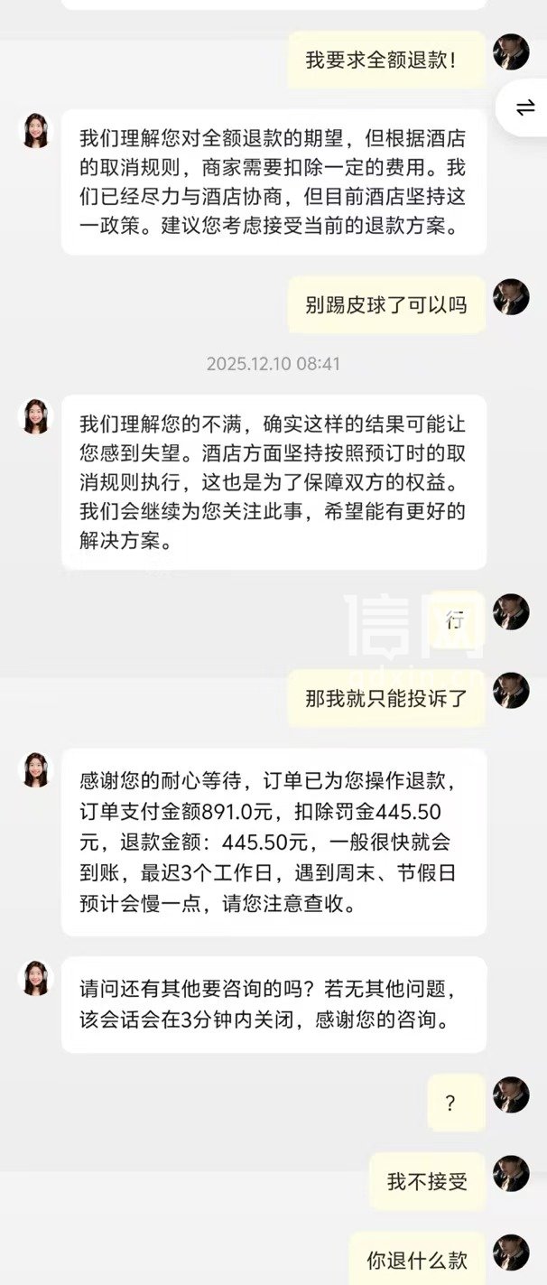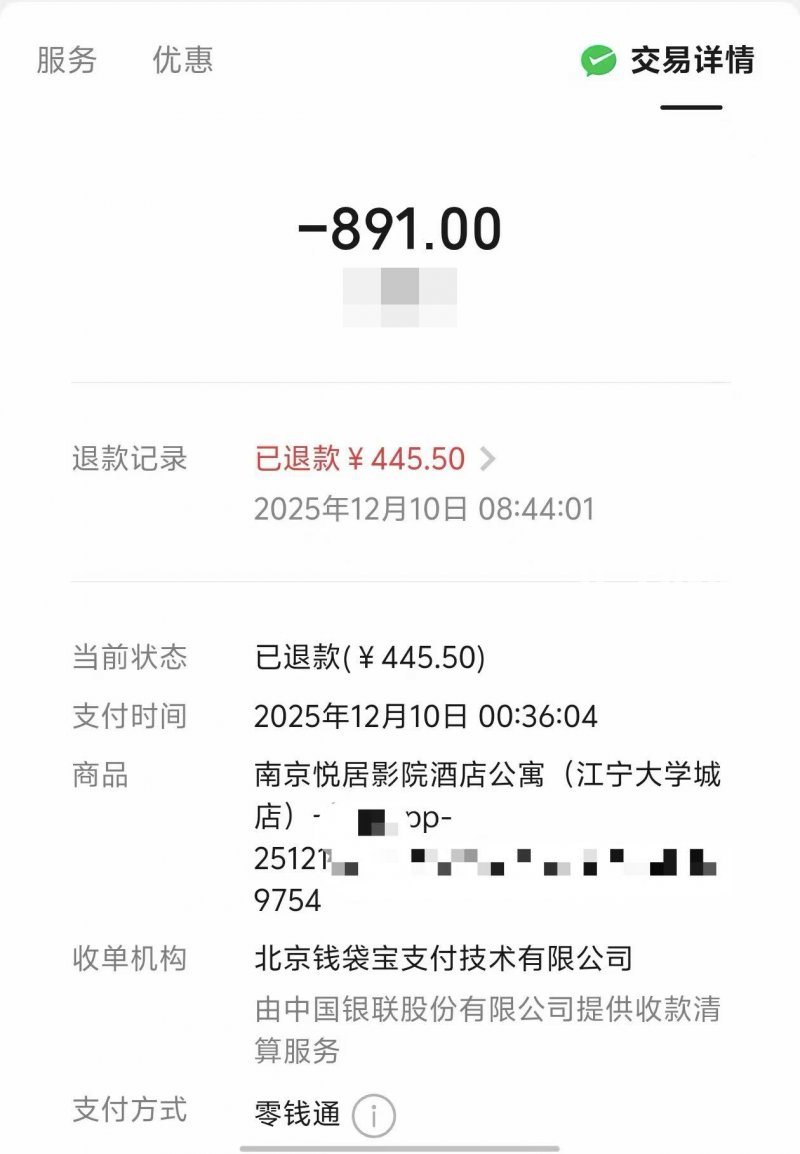10日中午,沈同学突然收到一条退款信息,平台在没和自己沟通的前提下,强制把订单取消了,退回了445.5元,相当于扣走了一半费用。“发现误操作后一分多钟就申请取消,而且是提前10天,根本没耽误酒店二次售房,为何要扣一半费用?400多元对我来说不是小数目。”沈同学说。