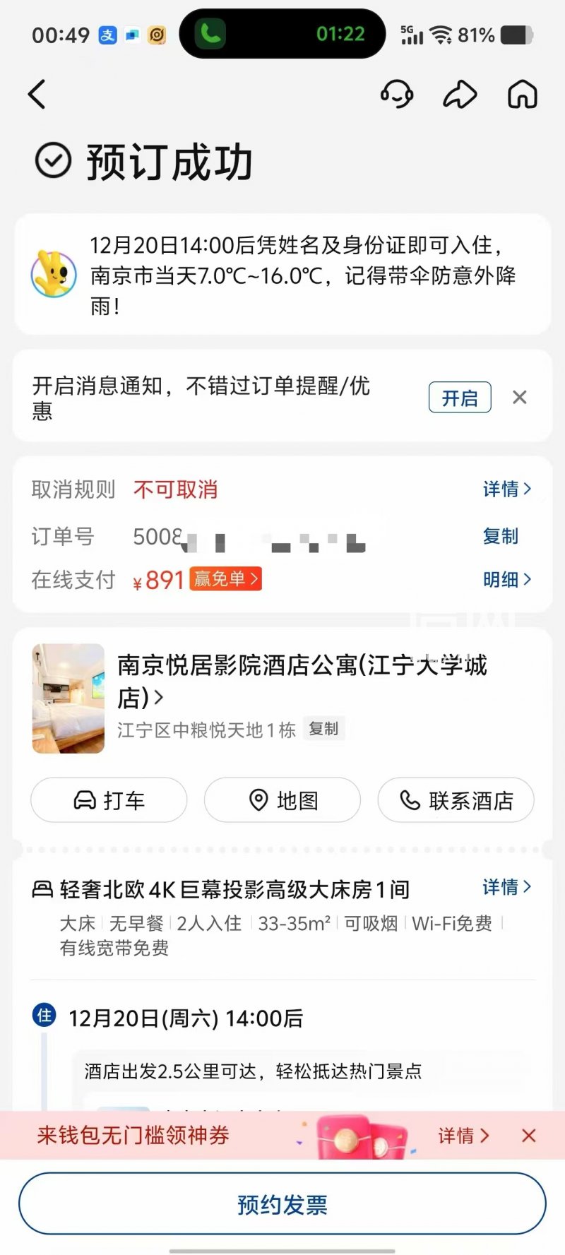 沈同学向信号新闻(0532-80889431)介绍说,为了准备12月20日-21日的研究生考试,12月10日凌晨,她在一生活服务平台刷到了距考点仅800米的“南京悦居影院酒店公寓”。0时36分,沈同学下单支付了两晚共891元的房费。但她很快发现,自己本应预订19日-20日的房间,误选成了20日-21日。“我点进订单想要取消,却怎么也找不到退款按钮,这时才看到下单页上有‘不可取消’的字样。”沈同学说,无奈之下,自己在0时38分给商家发消息,说明了事情经过,申请退款,酒店客服则回复称:“手头有事,先找平台,明天再联系。”