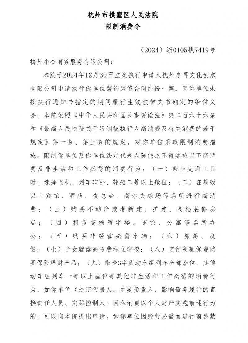 2025年年初的一份“限高令”,似乎也让这位粉丝量颇高的网红“不差钱”形象有所打折。企查查平台信息显示,陈伟杰持股60%并担任法定代表人的梅州小杰商务服务有限公司,于2024年底被杭州市拱墅区人民法院立案执行;后因未按执行通知书履行装饰装修合同纠纷中的115856元给付义务,该公司法定代表人陈伟杰被采取限制消费措施。限制消费令禁止陈伟杰进行高消费及非生活和工作必需的消费行为,包括乘坐飞机、列车软卧、G字头动车全部座位,在星级酒店高消费,购买不动产、非经营必需车辆,旅游度假,子女就读高收费私立学校等。法院明确,若违反限制消费令,将依法予以罚款、拘留;情节严重构成犯罪的,还会追究刑事责任。