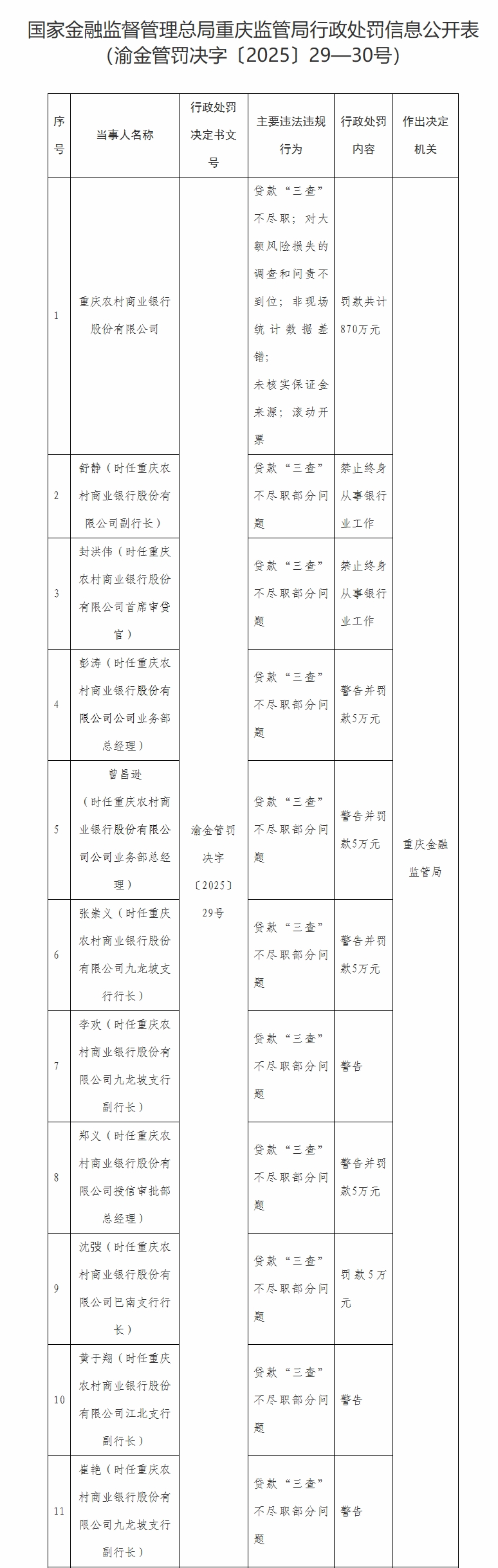 重庆金融监管局对重庆农商行处以共计870万元罚款,同时对相关责任人作出严厉处罚。其中,时任副行长舒静和首席审贷官封洪伟因贷款“三查”不尽职部分问题,被禁止终身从事银行业工作。此外,多名责任人受到警告或罚款处罚,包括公司业务部总经理彭涛和曾昌逊、九龙坡支行行长张崇义、授信审批部总经理郑义、巴南支行行长沈弢等人,罚款金额均为5万元,另有部分负责人被警告。
