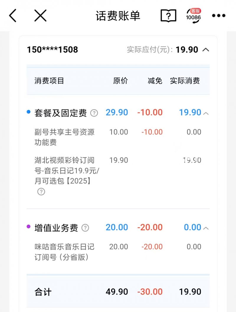 周先生告诉信号新闻,自己习惯交完费就对对账。2025年12月23日,他登录移动App“查账”时发现,在最近一份话费清单里,多了一项湖北视频彩铃订阅号的增值服务费,实际扣款19.9元,而且这个费用记在了其母亲使用的号码上。他向母亲询问此事,得到的答复是:“不知道怎么弄的”。
