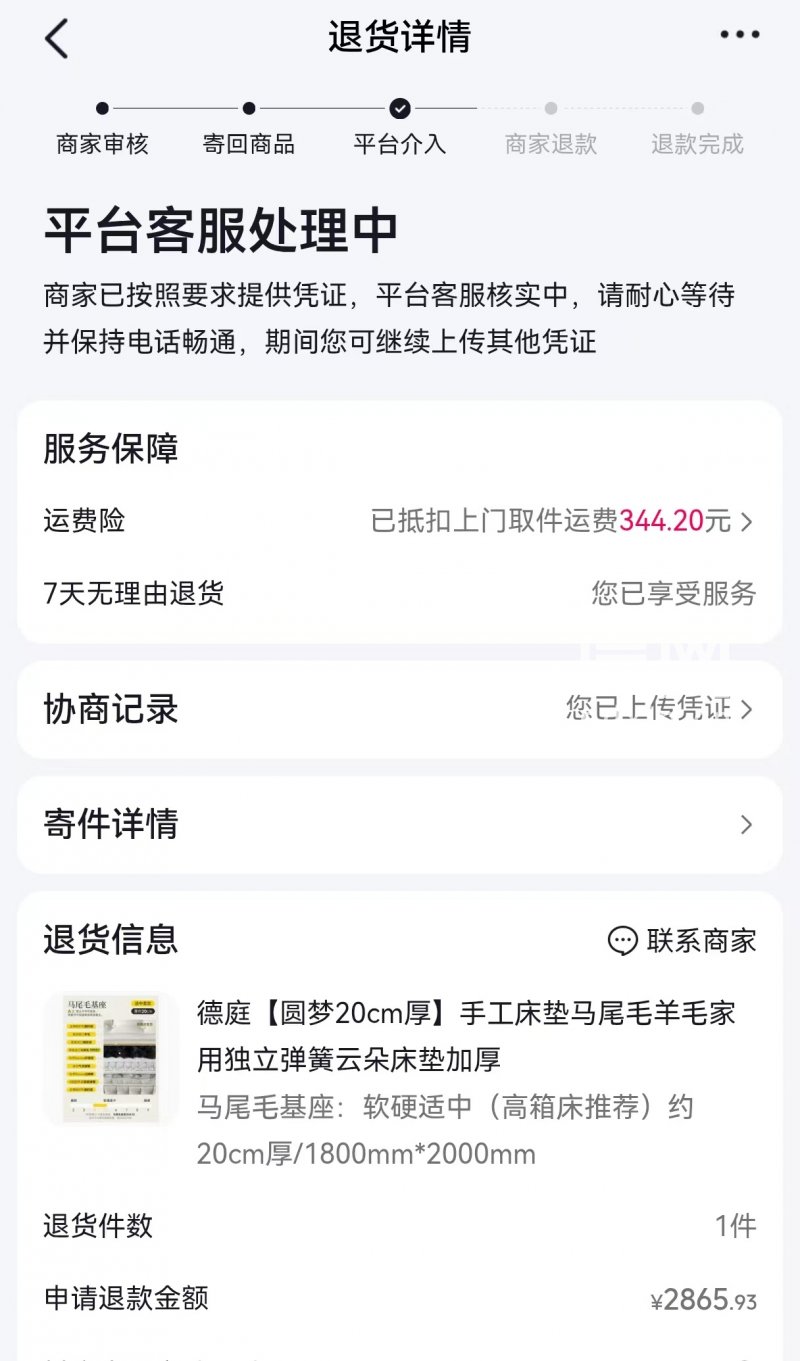 12月3日,秦女士在一家直播平台的德庭家具旗舰店购买了一款以马尾毛为基座的床垫,实付2863.81元。收到货后,秦女士感觉床垫睡起来不舒服,就申请了退货,退回到广东佛山。平台自动分配了德邦快递负责运输,退货运费由该订单的大件运费险承担。“为了防止在运输过程中出现损坏,我和家人特意做了双层包装,内层是防水透明薄膜,外层也用防水材质包裹,用胶带封得很严实,确认没问题才交给快递员。”秦女士说。