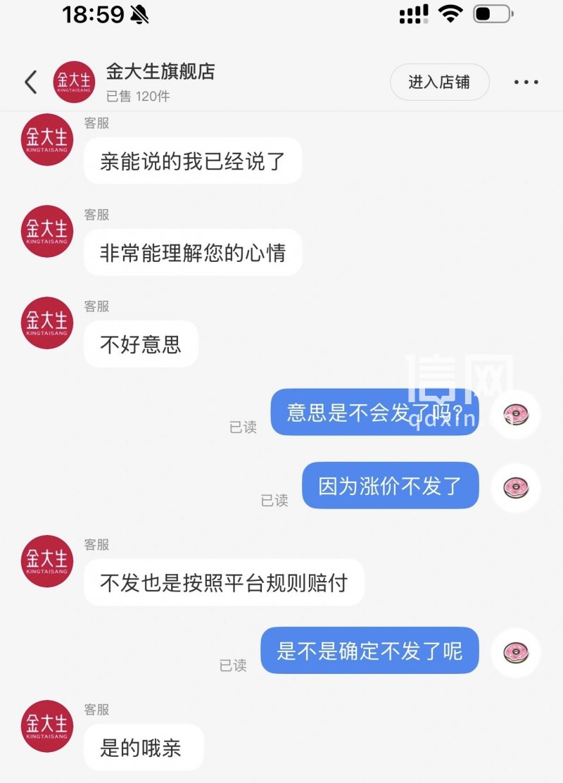针对此事,信号新闻先联系了金大生旗舰店,客服表示未按时发货将严格按照平台规则进行赔偿。但对于是否因铂金涨价导致拒发的疑问,客服未正面回应,仅强调“商品已缺货”。商家同时明确,超时发货赔付完成后,订单将自动终止,不再履行发货义务,也不承担金价波动产生的差价损失,并指出消费者款项目前仍由小红书平台保管,尚未进入商家账户。