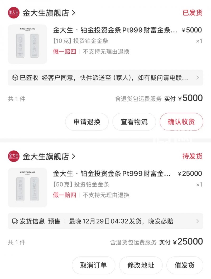 段先生向信号新闻表示,2025年12月24日,他在小红书金大生旗舰店分两单下单了铂金投资金条Pt999:凌晨4时29分下单50克,花费25000元;早上7时下单10克,花费5000元,两单合计30000元。“当时铂金价格正处于上涨通道,才果断入手。”作为贵金属市场的投资者,段先生看好铂金的保值增值潜力。