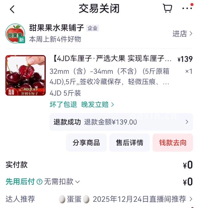 信网·信号新闻1月8日讯 知名主播“蛋蛋”直播间宣传的“4JD严选大果”,顾客买到手规格却只有3J甚至2J,且坏果率较高。近日,“蛋蛋”推荐的一款车厘子引发消费者投诉。部分消费者举证后获得退款,也有网友反映维权受阻,目前涉事商品链接已下架。