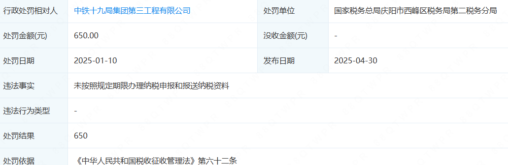 企查查平台信息显示,中铁十九局集团第三工程有限公司成立于2002年2月4日,法定代表人郭明明,公司地址为沈阳市沈北新区沈北路36号,系中国铁建集团三级子公司。中铁十九局集团第三工程有限公司拥有18家分支机构,目前均已处于注销或吊销状态。2025年1月10日,该司因未按照规定期限办理纳税申报和报送纳税资料,被国家税务总局庆阳市西峰区税务局第二税务分局处罚650元。(信网记者)
