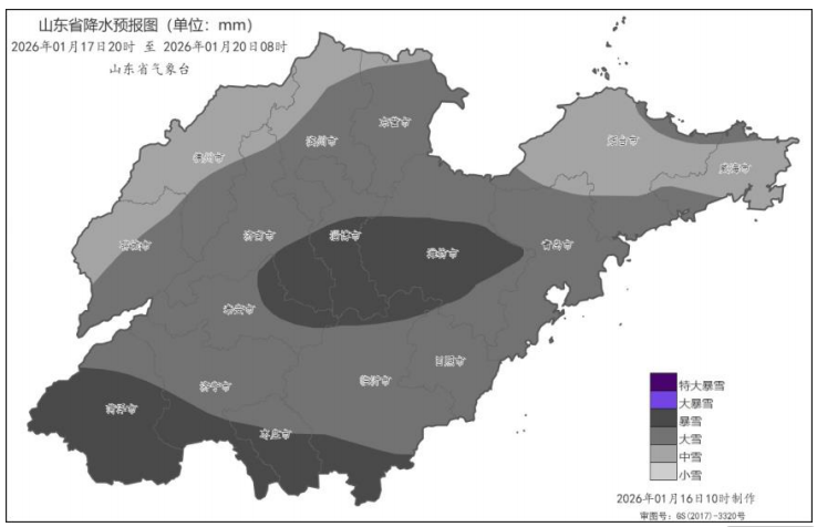 17日夜间至19日夜间,山东省将出现大范围雨雪天气,过程累积平均降水量8~15毫米。其中,17日夜间,鲁西北、鲁中和半岛地区有小雪或雨夹雪,鲁南地区有小雨;18日白天到19日夜间,济南、泰安、淄博和潍坊有大雪到暴雪,菏泽、济宁、枣庄、临沂和日照有小雨或雨夹雪转大雪局部暴雪,聊城、德州、滨州、东营、烟台、威海和青岛有中到大雪,鲁中山区局部有冻雨。积雪深度3~8厘米,最大可达12厘米以上,将出现对交通有较大影响的道路结冰。