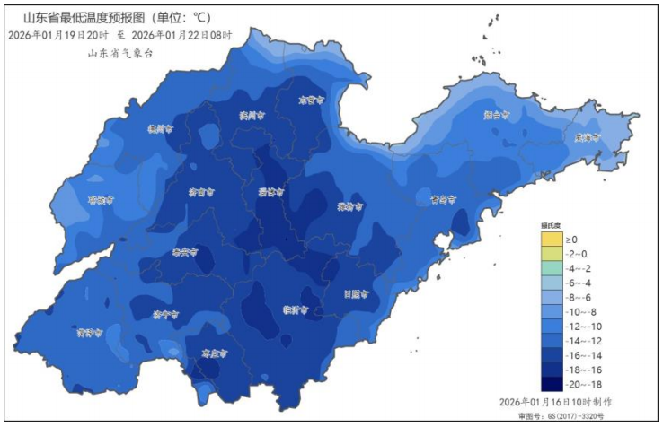 16日起山东省气温持续下降,过程降温幅度:10~12℃,局部地区超过14℃。20日早晨最低气温:鲁西北和鲁中山区-16~-14℃,局部低于-18℃,沿海地区-8~-6℃,其他地区-10~-8℃。21—25日仍有低于-12℃的低温天气。