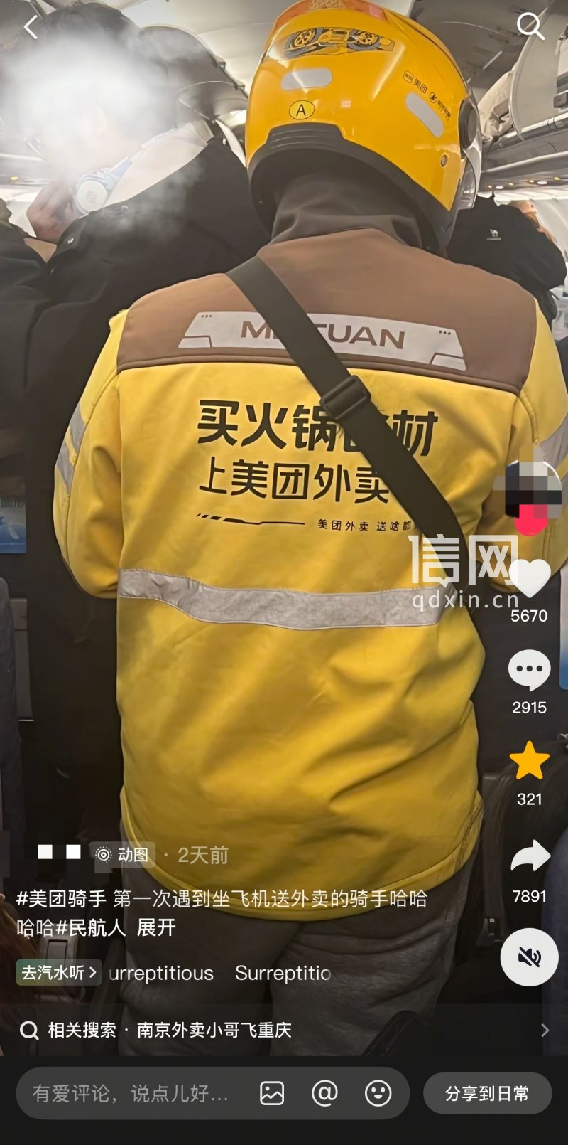 信网·信号新闻1月20日讯 “第一次遇到坐飞机送外卖的骑手!”1月13日,一网友分享了自己乘机时遇到身着全套美团工服的外卖骑手的新鲜事。起初她以为是骑手赶路匆忙或是准备返乡,忘了脱下工服,上前细问后才知道,对方是专程坐飞机跨省跑腿送单的。据悉,此单客户支付了5200元配送费,还报销了往返机票。