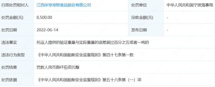 企查查平台信息显示,江西华亨宠物食品股份有限公司成立于2011年5月19日,法定代表人周青标,企业地址为江西省九江市瑞昌黄金工业园南区东环路。2022年6月14日,该司因托运人提供的验证重量与实际重量的误差超过百分之五或者一吨,被中华人民共和国宁波海事局罚款8500元。
