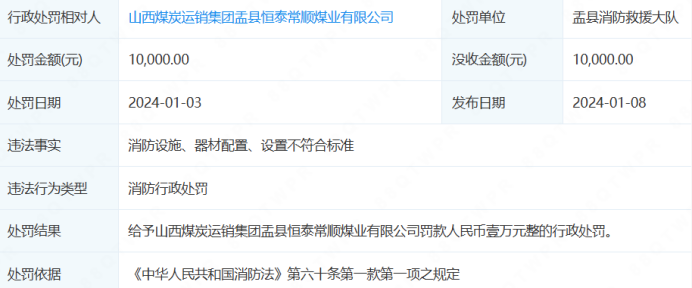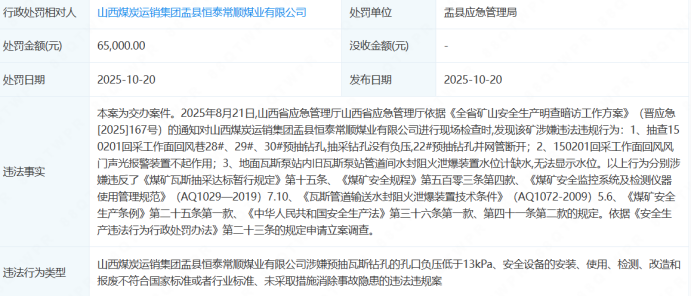2025年10月20日,该公司因瓦斯钻孔不达标、安全设备不合规且未消除隐患被立案调查,被盂县应急管理局处罚6.5万元;2024年1月3日,因消防设施、器材配置设置不符合标准,被盂县消防救援大队罚款1万元。