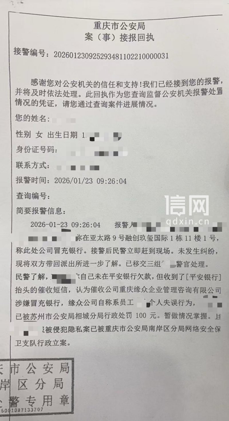 王女士还透露,2026年1月23日,她就重庆缘众企业管理咨询有限公司疑似冒充“平安银行”发送催收短信一事再次报案。根据她提供的重庆市公安局南岸区分局接处警记录显示,王女士称未在平安银行欠款,却收到以“平安银行”为抬头的催收短信,她认为该公司存在冒充金融机构的行为。涉事公司对此回应称系“员工个人失误”。