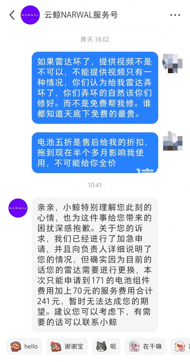 对此李女士并不认可,她说,故障前一天自己使用这台机器人时,其走位没有任何问题,一点激光雷达出问题的征兆都没有,怎么可能突然就坏了?她要求提供检测过程的视频或其他证据,证明这个故障确实存在,且是其收货前就有的故障。而云鲸始终未能提供。李女士觉得,没有这些证据,厂家就有虚增故障、提高维修费的嫌疑。