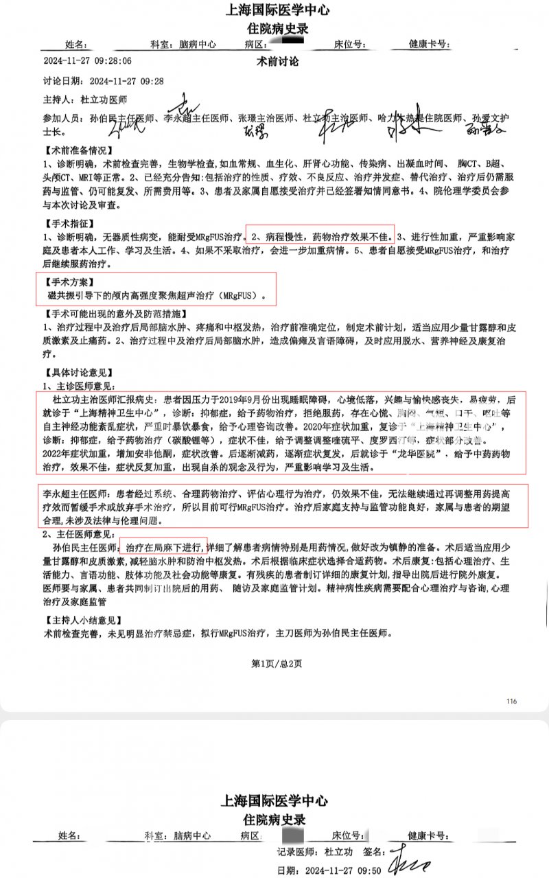 张女士没有找到这场手术单独的手术记录,只在住院病史录的术前讨论页,看到了主诊医师、主任医师的意见。讨论页的小结意见中写到:术前检查完善,未见明显治疗禁忌症,拟行MRgFUS治疗,主刀医师为孙伯民主任医师。