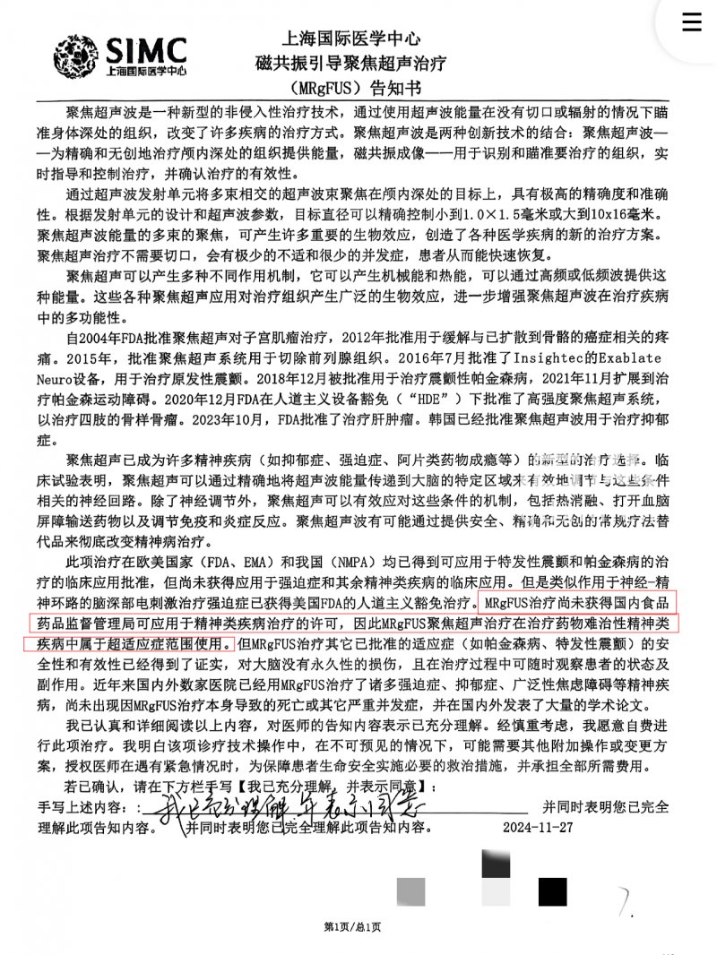 悲剧发生后,张女士一直想为女儿讨个说法。她在梳理女儿手术期间的材料时,才仔细阅读了上海国际医学中心磁共振引导聚焦超声治疗(简称“MRgFUS”,即“磁波刀”)告知书,其中写明该治疗“尚未获得国内食品药品监督管理局可应用于精神类疾病治疗的许可,因此MRgFUS聚焦超声治疗在治疗药物难治性精神类疾病中属于超适应症范围使用”。
