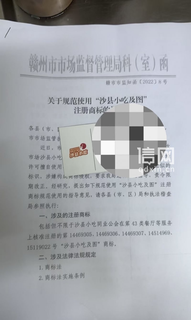 从网友发布的图片看,文件抬头是“赣州市市场监督管理局科(室)函”,内容与规范使用“沙县小吃及图”注册商标有关。