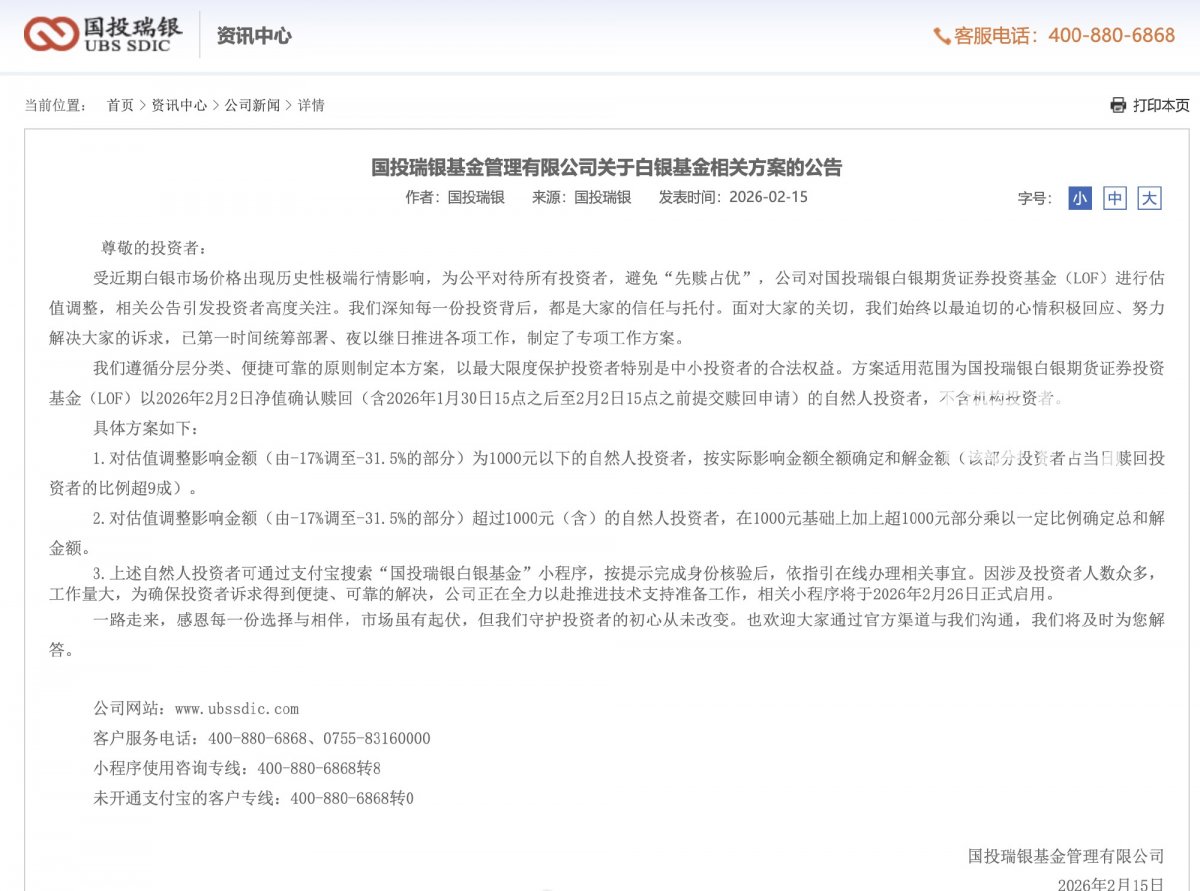 2月15日,国投瑞银基金管理有限公司发布公告,针对旗下国投瑞银白银期货证券投资基金(LOF)因近期白银市场极端行情引发的估值调整问题,公布了专项补偿方案,以公平对待所有投资者,避免“先赎占优”。