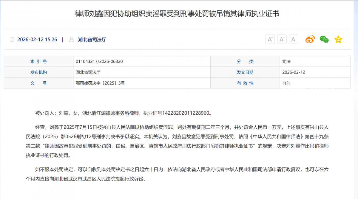 信网·信号新闻2月27日讯 2月12日,湖北省司法厅发布一则行政处罚决定书:湖北清江源律师事务所律师刘某因犯协助组织卖淫罪,被依法吊销执业证书。信号新闻(0532-80889431)了解到,这意味着刘某终身不得再从事律师职业。有律师在社交平台发文称,刘某长期滥用律师身份和专业法律知识,为当地一个组织卖淫的团伙提供全方位、核心化的犯罪协助。