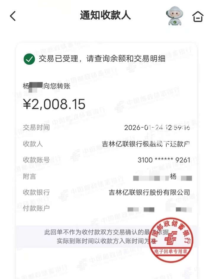 杨先生介绍说,2025年2月,因家人患病,他在“你我贷”平台借了20000元网贷用于治病,之后每月14日平台都会从他绑定的银行卡中扣除2008.15元的分期还款金额。2025年8月,杨先生绑定的银行卡因风控冻结,无法正常扣款,他在还款日前联系了平台,询问其他的还款方式。平台告诉他,可每月24日前向平台咨询具体的还款金额,之后将款打到平台提供的对公账户。