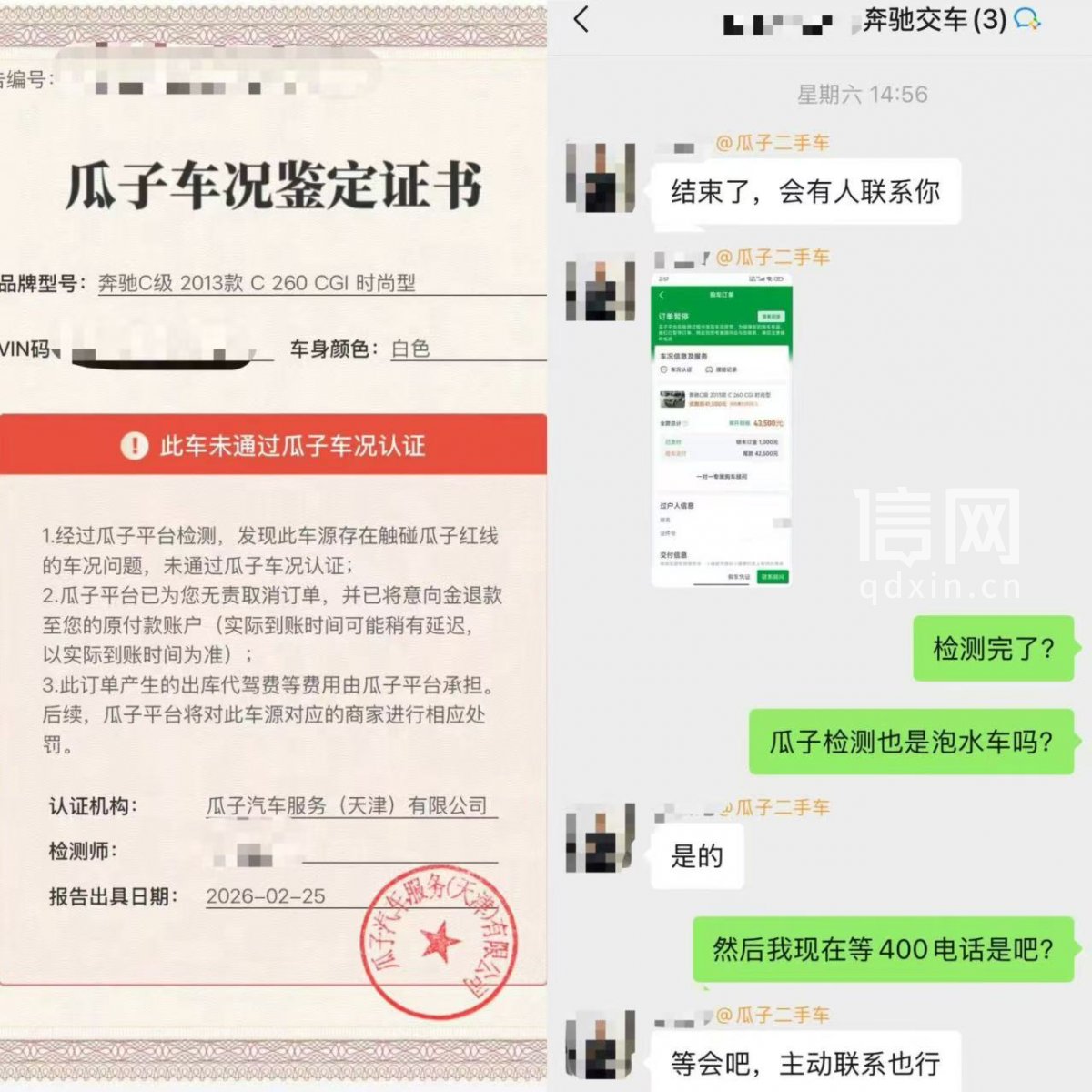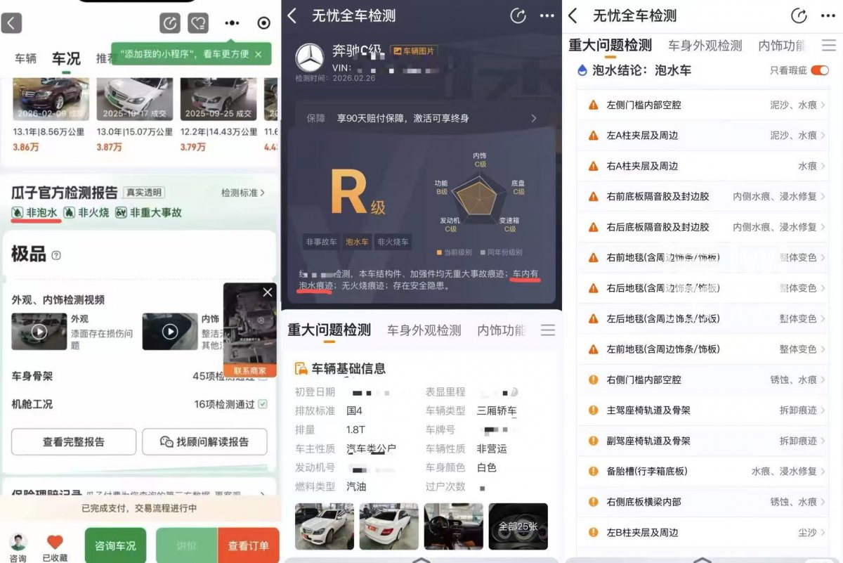 今年2月,张先生通过瓜子二手车平台看中了一辆“奔驰C级 2013款 C260CGI时尚型”,标价4.35万元。平台出具的官方检测报告明确注明该车“非泡水、非火烧、非重大事故”,在付款前,售前人员也承诺“支持任何正规三方机构检测”并称“平台检测比市面大部分机构更权威”。于是,张先生支付了1000元的锁车订金,并自行花费599元委托一家第三方检测机构对车辆进行全车检测。按照平台的流程,约定检测无误后再支付尾款。