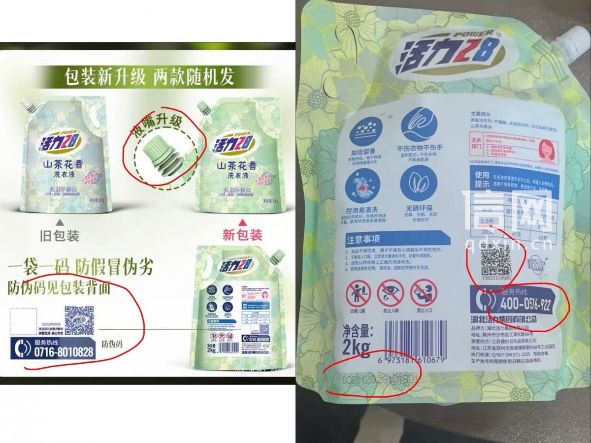杨先生对照淘宝“活力28”官方旗舰店发布的外包装鉴定指南进行核对,发现正品防伪码中间印有清晰的“活力28”品牌logo,其购买的产品并无该标识;同时,商品包装印制的服务热线与正品号码完全不同。“对比之后一眼就能看出是假货,破绽十分明显。”杨先生说。