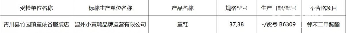 信网·信号新闻3月18日讯 据四川省市场监督管理局3月9日发布的2026年省级监督抽查不合格产品清单,标称生产单位名称为温州小黄鸭品牌运营有限公司的童鞋抽检不合格,不合格项目为邻苯二甲酸酯。