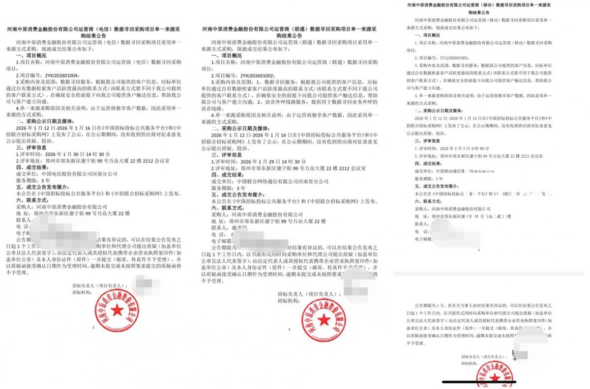 今年2月,中原消费金融发布了“运营商数据寻回采购项目”单一来源采购结果公告,中国电信股份有限公司河南分公司、中国移动通信集团河南有限公司等三大电信运营商都是中标单位。引人注意的是采购项目的内容:“根据中原消费金融提供的客户信息,应标单位通过自有数据检索客户活跃度最高的联系方式(该联系方式要不同于中原消费金融提供的客户联系方式),在确保安全的前提下向中原消费金融提供客户触达信息,帮助中原消费金融与客户建立沟通。”