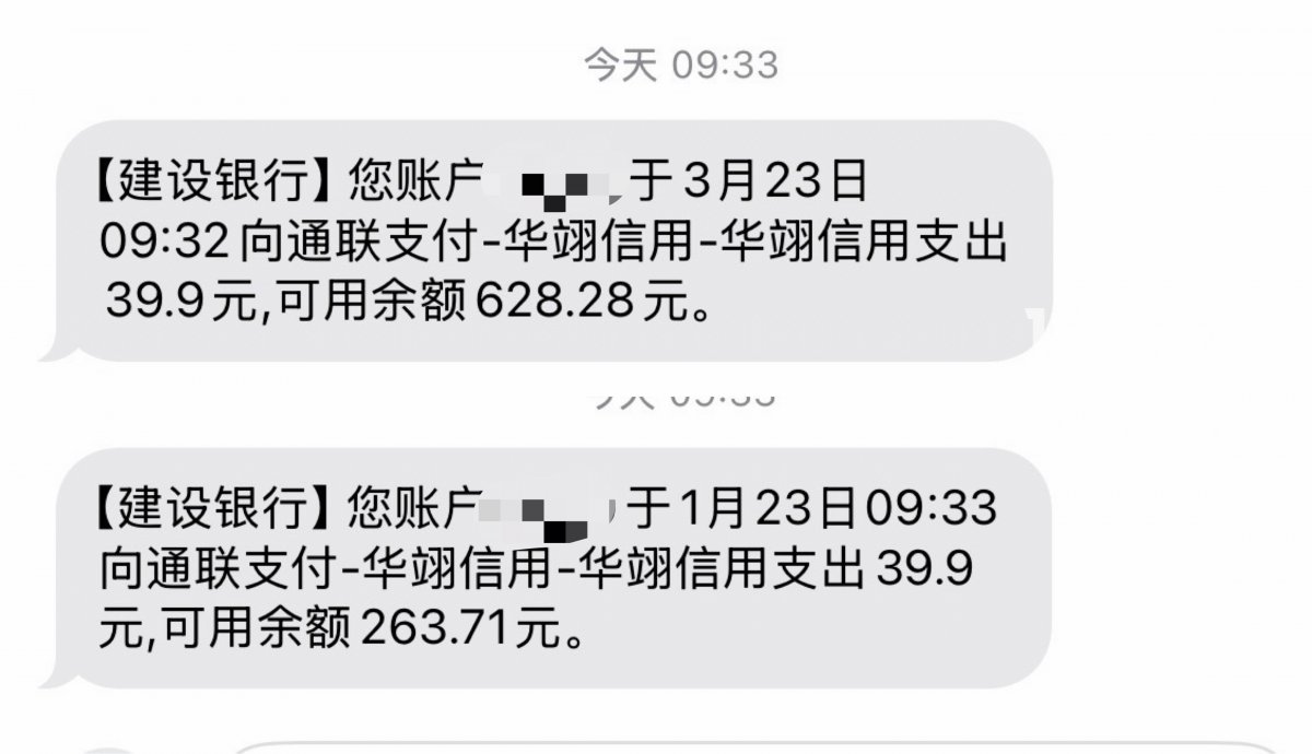 张先生是一名高中政治老师。今年3月份,他翻阅手机短信时,无意间发现一条39.9元的扣款通知,收款方显示为“华翊信用”。他往前翻记录,发现已陆续收到多次扣款通知。但张先生并不记得自己曾在这家公司消费过。