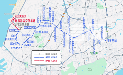 主站由汽车东站调整为瑞昌路公交停车场,副站由湖清路停车场调整为汽车东站,调整后为瑞昌路公交停车场—汽车东站。