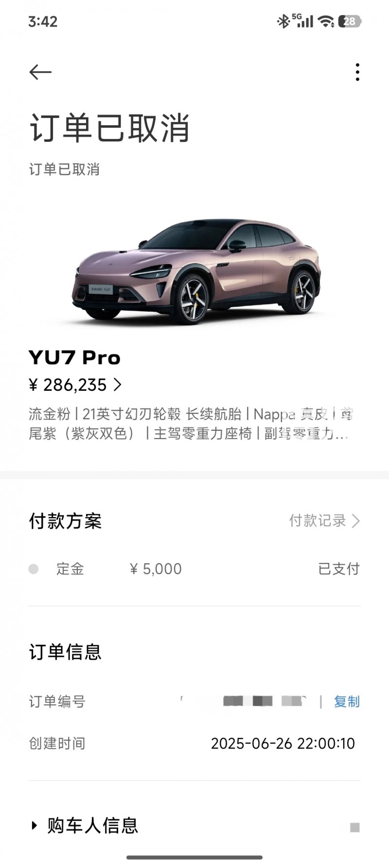2025年6月26日,谭女士“卡点”订了一辆小米YU7 Pro:通道开启后18秒付了5000元定金,3分钟内选完了配置和颜色,订车时App里显示预计27~30周交付。