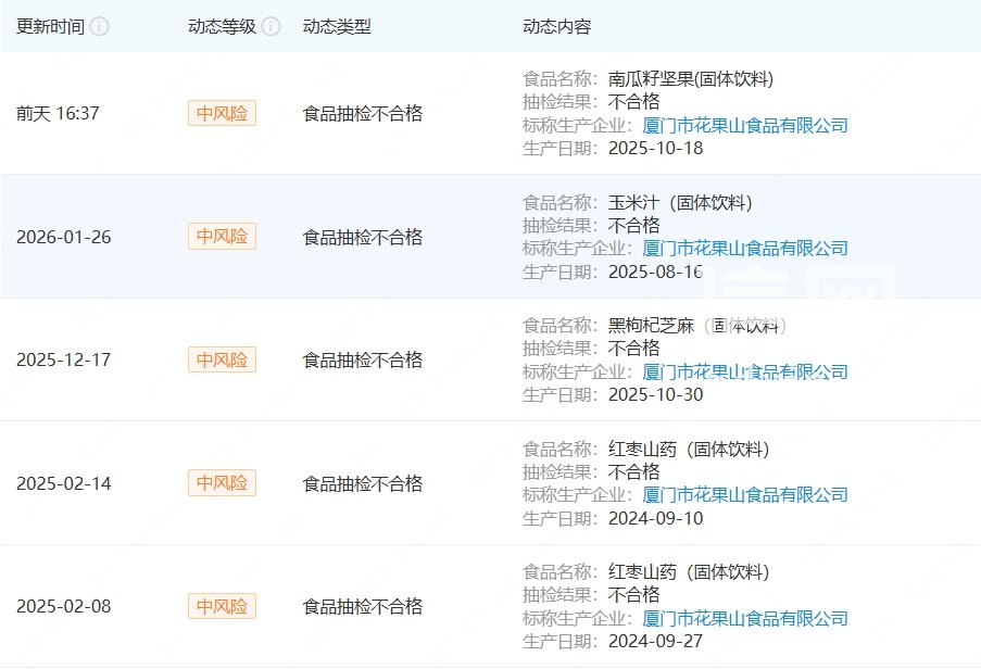 企查查平台信息显示,厦门市花果山食品有限公司成立于2005年1月21日,法定代表人黄爱来,位于福建省厦门市同安区。该公司主要从事饮料生产、食品生产以及水果和坚果加工业务。值得注意的是,该公司并非首次出现产品抽检不合格问题,2025年以来,该公司生产的玉米汁、黑枸杞芝麻、红枣山药等固体饮料产品多次抽检不合格。(信网记者)