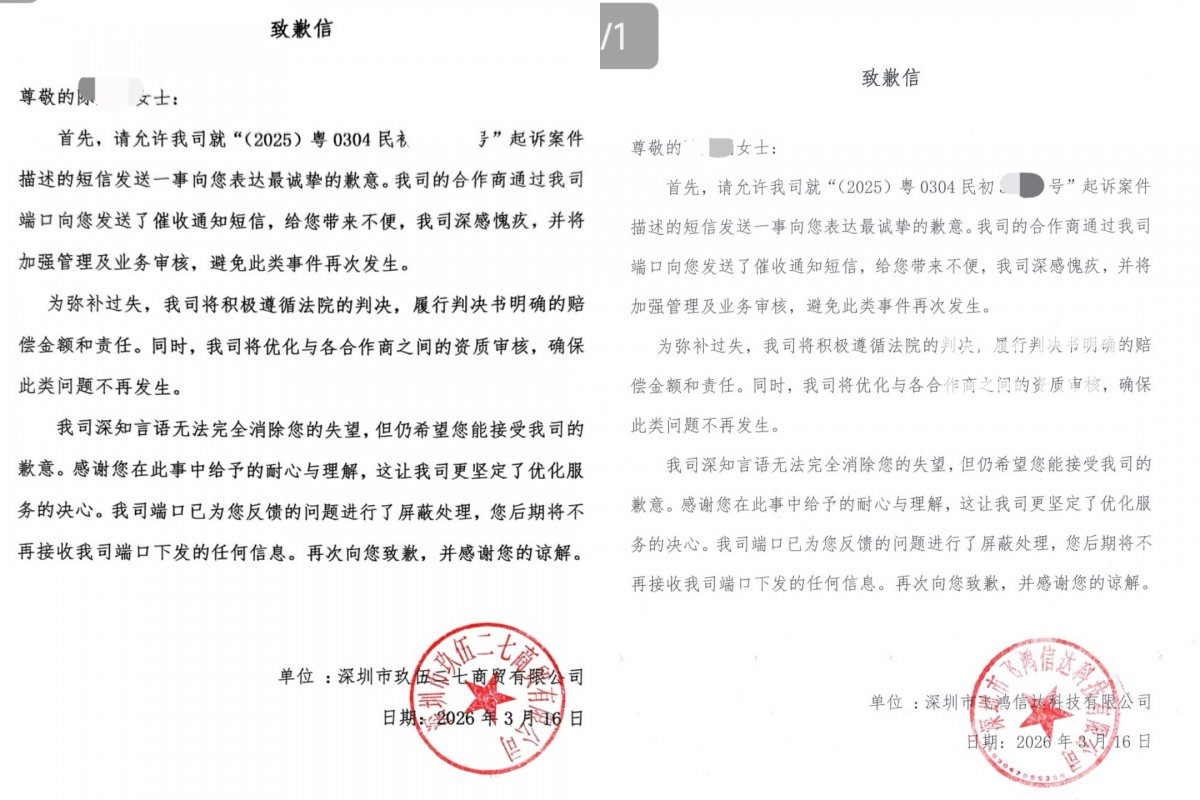 被告玖伍二七公司、飞鸿信达公司作为涉案短信码号使用方,未经合法授权,向陈女士及其亲友发送包含其个人信息的催收短信,且无法证明通讯录信息的合法获取渠道,其行为已侵犯陈女士隐私权及个人信息权益,理应承担相应侵权责任。2026年3月,深圳市福田区人民法院作出一审判决,责令玖伍二七和飞鸿信达两家公司向陈女士书面致歉,并赔偿陈女士一定的精神损害抚慰金,同时承担案件受理费。