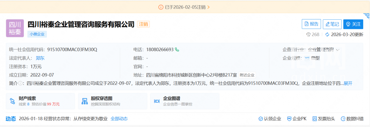 企查查平台信息显示,四川裕秦注册资本1万元,法定代表人郑东,成立于2022年9月7日,股东除了郑东持有60%股份外,还有一名自然人杨秀丽持股40%,其名下有6家关联公司。四川裕秦在陈女士案件判决前,也就是2026年2月5日,就已经注销。