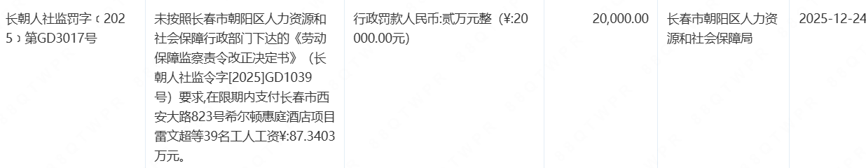 2025年12月24日,该公司因拖欠长春市西安大路823号希尔顿惠庭酒店项目雷文超等39名工人工资87.3403万元,被长春市朝阳区人力资源和社会保障局处以罚款2万元。