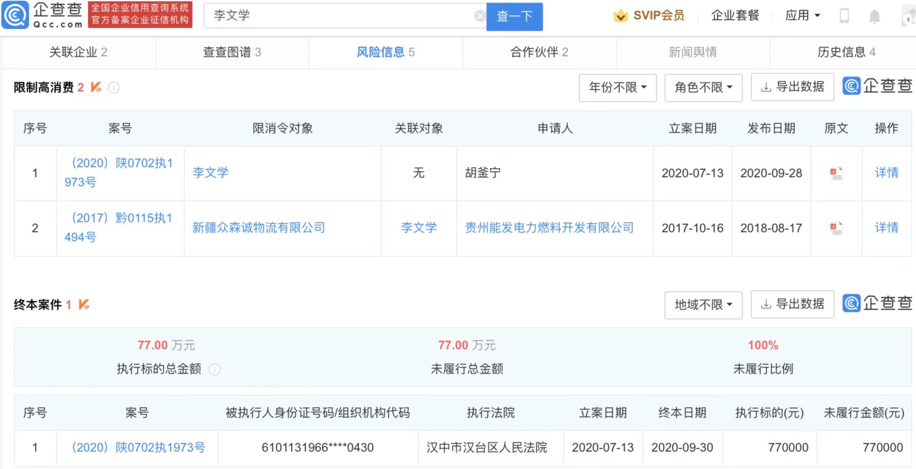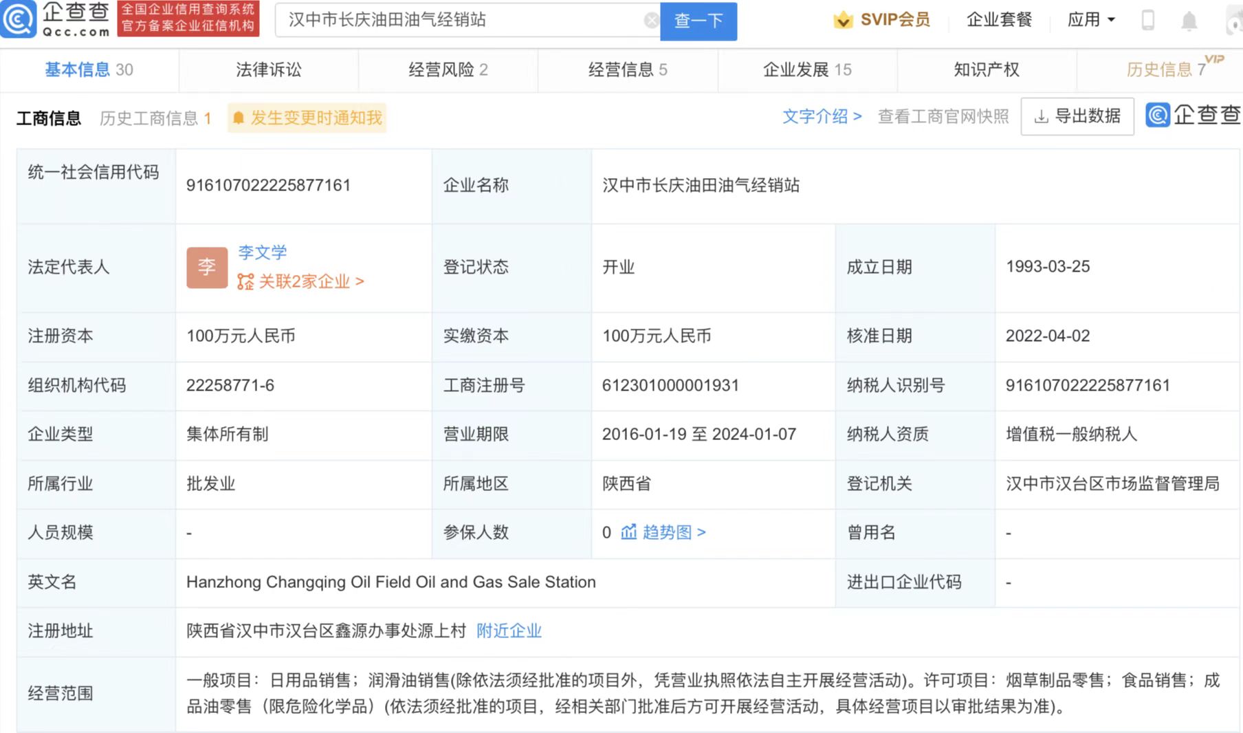 企查查显示,汉中市长庆油田油气经销站成立于1993年,法定代表人为李文学,注册资本100万元人民币,经营范围包含:烟草制品零售;食品销售;成品油零售等。企查查信息显示,该公司法定代表人李文学已被限制高消费,未履行总金额为77万元。