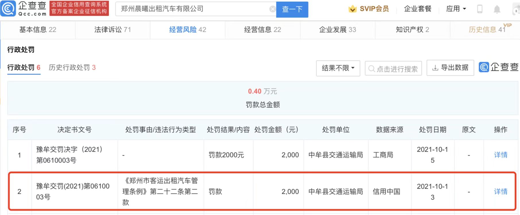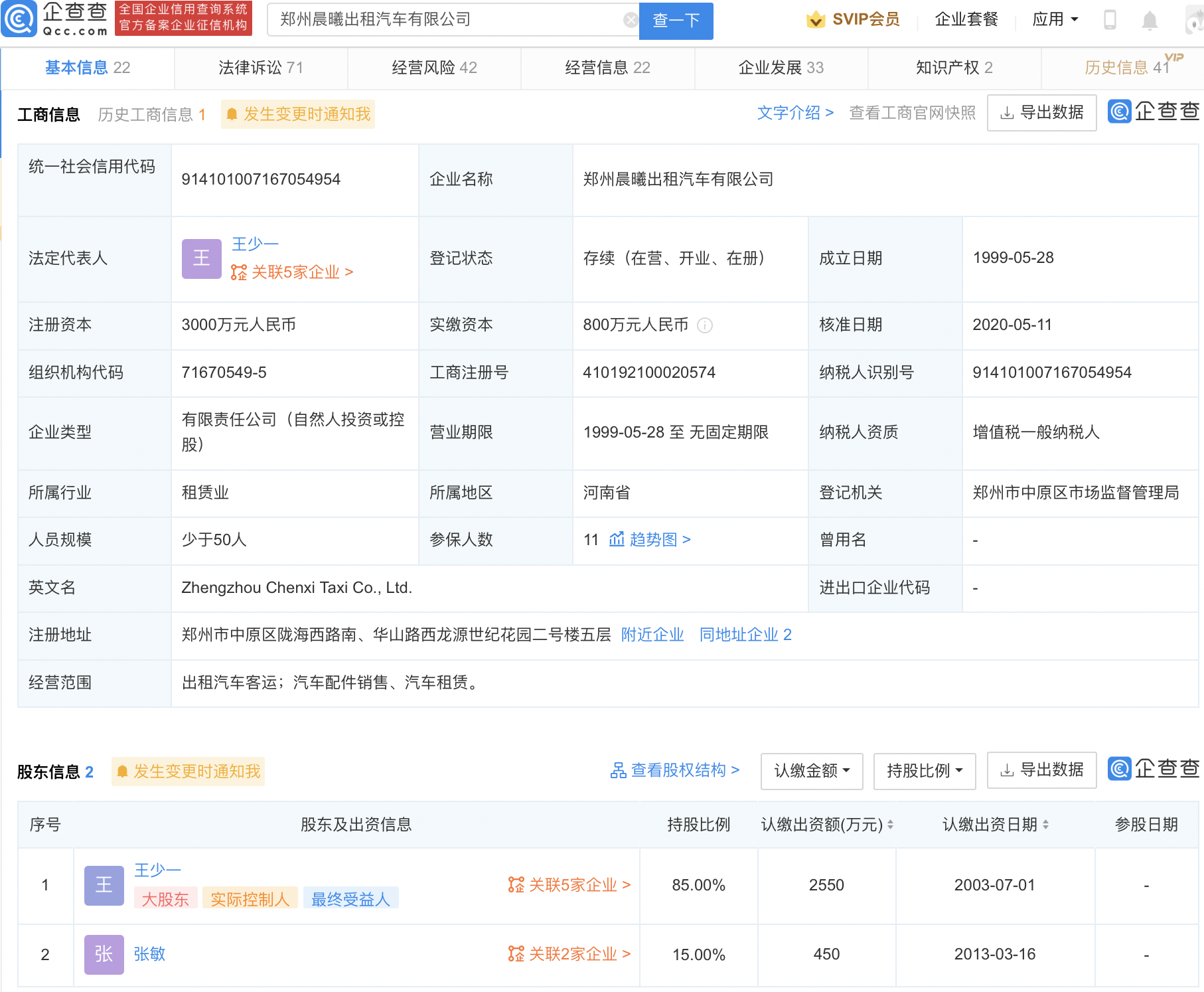 企查查显示,郑州晨曦出租汽车有限公司成立于1999年,法定代表人为王少一,注册资本3000万元人民币,经营范围包含:出租汽车客运;汽车配件销售、汽车租赁。企查查信息显示,该公司曾因违反《郑州市客运出租汽车管理条例》被行政处罚,具体违法行为类型为从事异地营运活动。(信网记者)